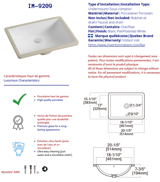 Évier rectangulaire sous plan de 21 po en porcelaine